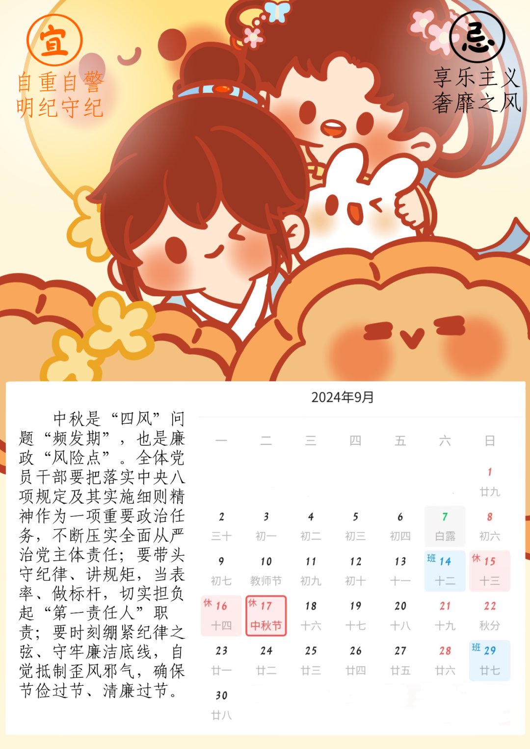 中秋是“四風”問題“頻發(fā)期”,也是廉政“風險點”。全體黨員干部要把落實中央八項規(guī)定及其實施細則精神作為一項重要政治任務,不斷壓實全面從嚴治黨主體責任;要帶頭守紀律、講規(guī)矩,當表率、做標桿,切實擔負起“第一責任人”職責;要時刻繃緊紀律之弦、守牢廉潔底線,自覺抵制歪風邪氣,確保節(jié)儉過節(jié)、清廉過節(jié)。