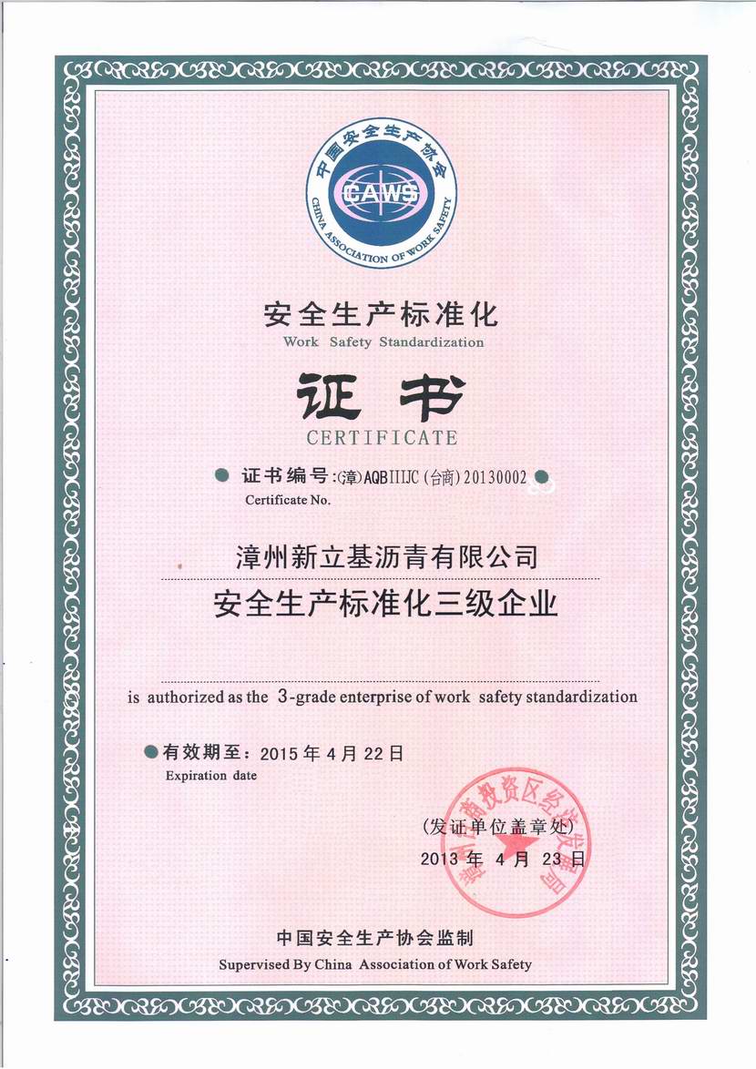 *    2013年6月5日漳州新立基瀝青有限公司正式獲取由漳州臺(tái)商投資區(qū)經(jīng)濟(jì)發(fā)展局核發(fā)的安全生產(chǎn)標(biāo)準(zhǔn)化三級(jí)企業(yè)證書,自從我司引入安全生產(chǎn)標(biāo)準(zhǔn)化管理,庫區(qū)已經(jīng)運(yùn)行了近一年時(shí)間,公司安監(jiān)部將以此為契機(jī)在安全月加強(qiáng)與庫區(qū)的宣傳、與大家共同努力,在安全工作上取得有效進(jìn)步。