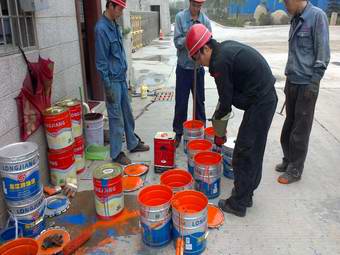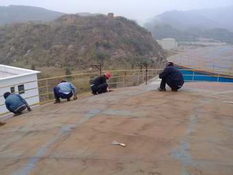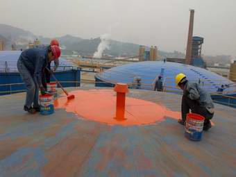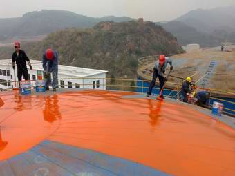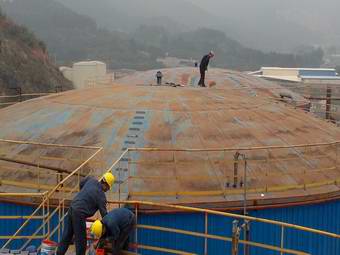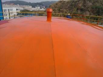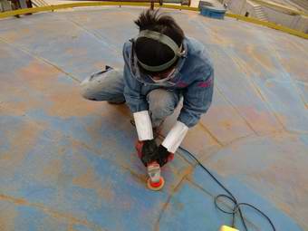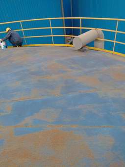 1月5日首先對1000T、500T罐頂部進(jìn)行除銹上漆。下圖:左邊第一道紅丹防銹漆,右邊為第二道孔雀蘭面漆后效果圖