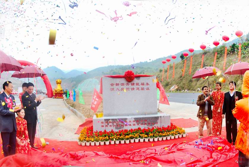 11月28日上午,福永高速方廣巖隧道口,彩旗飄飄,鼓樂齊鳴,由福建聯(lián)合石油化工有限公司、福建省交通運輸集團(tuán)有限責(zé)任公司主辦,福建省交通建設(shè)投資有限公司所屬廈門新立基有限公司承辦的“合新”瀝青鋪筑福永慶典活動在這里隆重舉行!60個空飄汽球,數(shù)百盆的鮮花,把整個會場裝飾得喜慶熱烈。慶典的舞臺座落在方廣巖風(fēng)景秀麗的山峰下,舞臺正中是一幅繪有聯(lián)合石化廠區(qū)、交通集團(tuán)瀝青儲罐及四通八達(dá)高速公路網(wǎng)的巨幅畫面,上面“‘合新’瀝青鋪筑福永慶典”十個大字熠熠閃光。舞臺的前方矗立著一塊用紅綢布遮著的石碑。