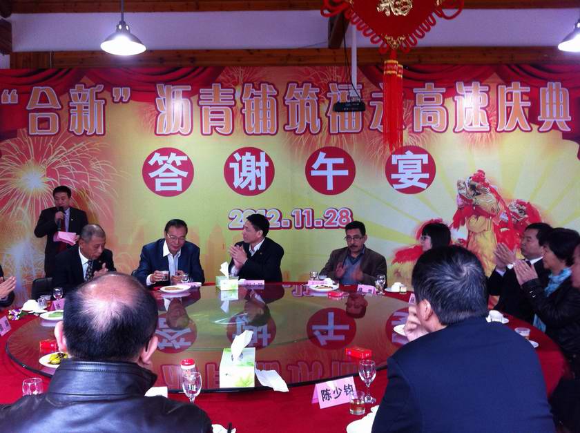 中午12時,“合新”瀝青鋪筑福永慶典活動答謝宴會咋福州龍泉山莊舉行。賓主雙方圍坐在一起,共同回憶,共同展望,大家頻頻舉杯,為共創(chuàng)“合新”品牌,鋪筑美好未來干杯!